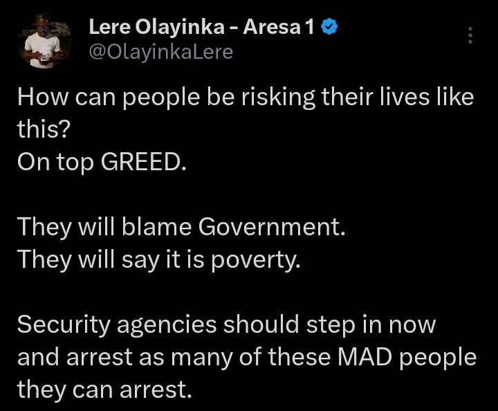 Lere Olayinka, the Senior Special Assistant on Public Communication and Social Media to the MInister of the Federal Capital Territory, FCT, Nyesom Wike, has taken to his official X account on Monday, January 19, 2026 to react to viral video of some Nigerians fetching diesel from a fallen tanker.