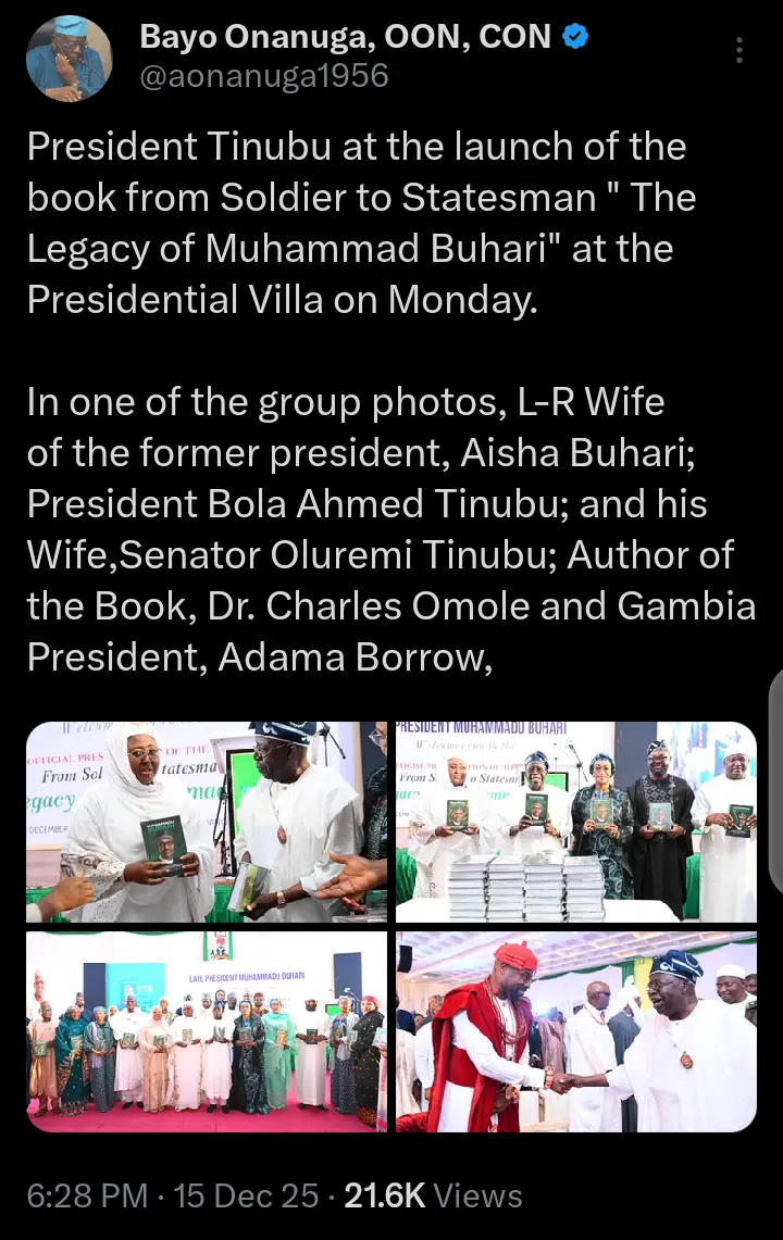 Nigerian activist and candidate of the African Action Congress, AAC in the 2023 presidential election, Omoyele Sowore has taken to his official X account on Tuesday, December 16, 2025 to react after President Bola Ahmed Tinubu launched a book in honour of former President, Muhammadu Buhari.