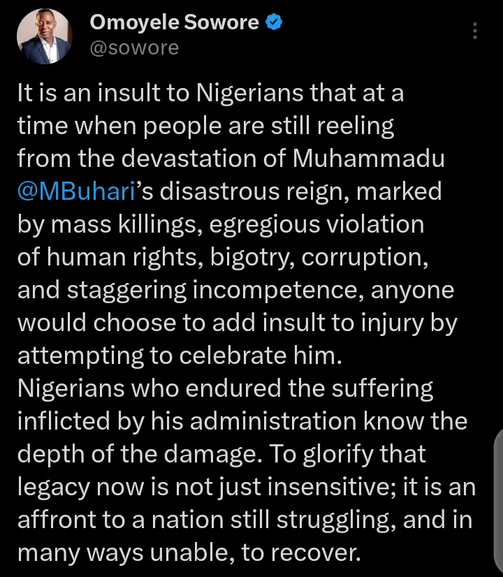 “Nigerians who endured the suffering inflicted by his administration know the depth of the damage. To glorify that legacy now is not just insensitive; it is an affront to a nation still struggling, and in many ways unable, to recover”.