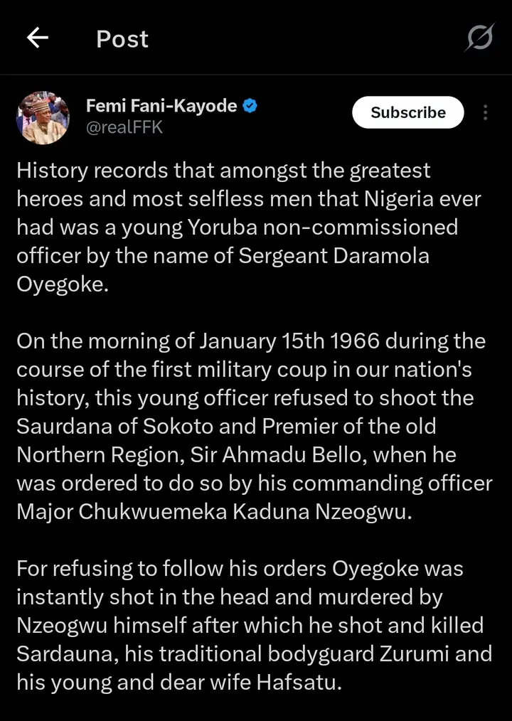 On his verified X handle, the former Minister of Aviation in Nigeria, Chief Femi Fani-Kayode, has revealed how a Nigerian soldier was shot dead after he refused to follow the order of his superior who instructed him to kill Sir Ahmadu Bello and others.