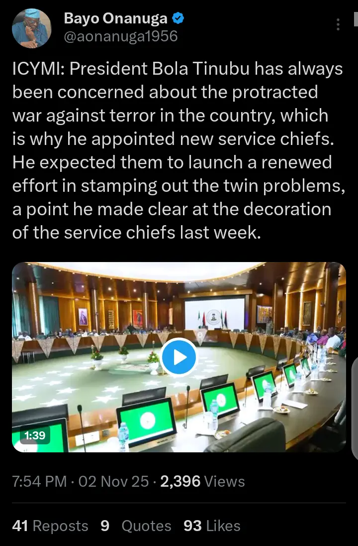 Bayo Onanuga, the Special Adviser to President Bola Ahmed Tinubu on Information and Strategy has taken to his official X account to react to the statement that was made by the President concerning the issue of insecurity in the country.