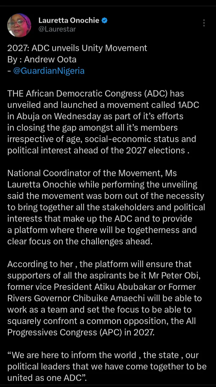 Lauretta Onochie, a Chieftain of the African Democratic Congress, ADC and former presidential aide has taken to her official X handle to react after the party unveiled the unity movement in Abuja. According to the statements which were shared on her official X handle, she pointed out that the movement was tasked with galvanizing support for the 2027 presidential candidate.