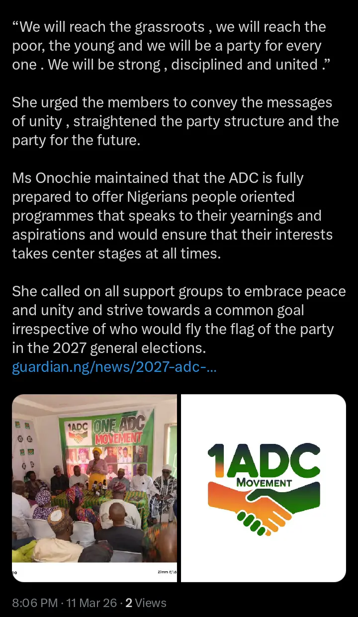 Lauretta Onochie, one of the Chieftains of the ADC and erstwhile presidential aide made the disclosure on her official X handle on Wednesday March 11th, 2026.