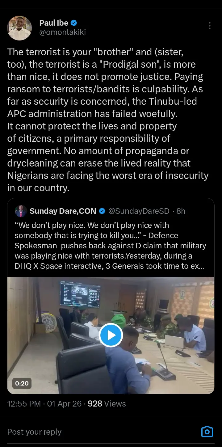 ‎In his post, Ibe explained that treating terrorists and bandits with sympathy or leniency does not bring justice, he argued that describing criminals in soft or emotional terms only weakens the seriousness of their crimes and insisted that people who carry out violent attacks should not be seen as misguided family members but as threats that must be dealt with firmly.