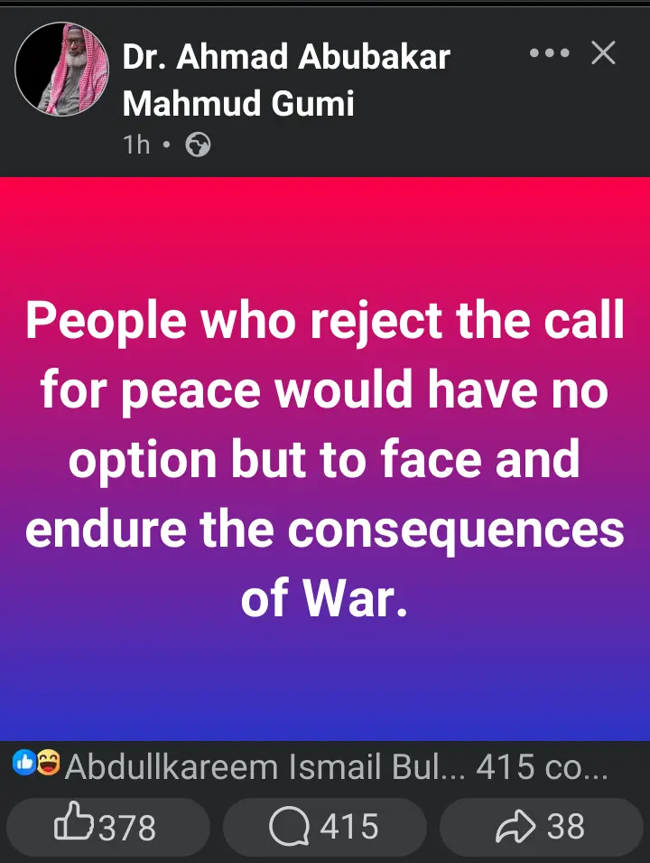Islamic scholar and cleric Shaikh Ahmad Gumi has issued a strong warning to those opposed to peace efforts with armed groups, stating that rejecting dialogue leaves only the painful option of enduring the consequences of war.