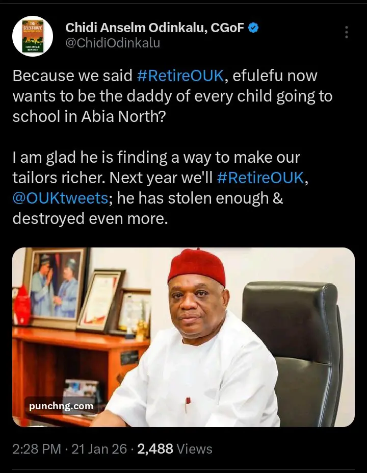 Odinkalu stated, “Now that we called for #RetireOUK, efulefu wants to act like the father of every schoolchild in Abia North? I’m pleased he’s helping our tailors. Next year, we will #RetireOUK; he’s taken enough and caused more harm,” in response to reports that the former governor of Abia State was involved in providing school uniforms to local students.