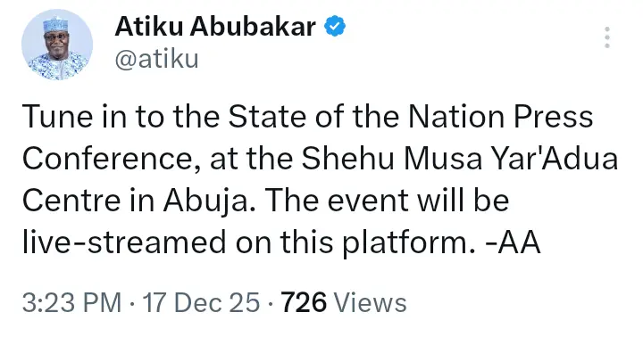 This announcement was contained in a post that the former Vice President of Nigeria shared on his official X handle on Wednesday, December 17, 2025.
