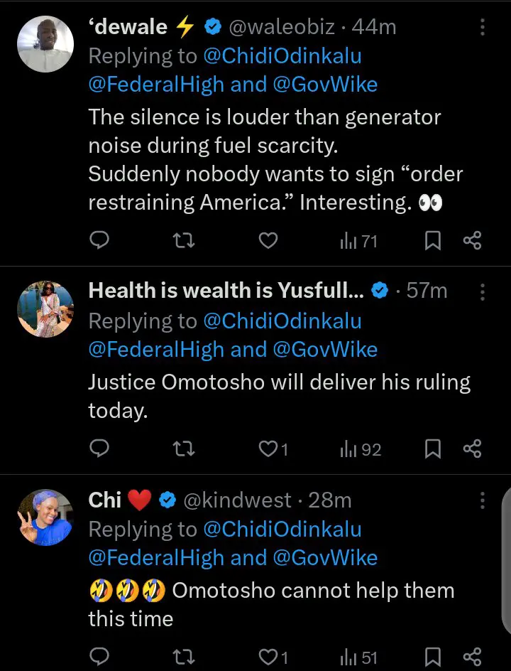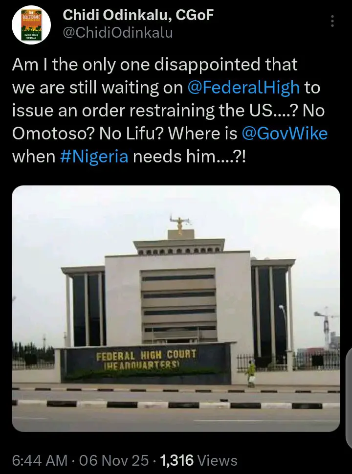 “Am I the only one disappointed that we are still waiting on Federal High Court to issue an order restraining the US? No Omotosho? No Lifu? Where is Nyesom Wike when Nigeria needs him,” he wrote on his X page.