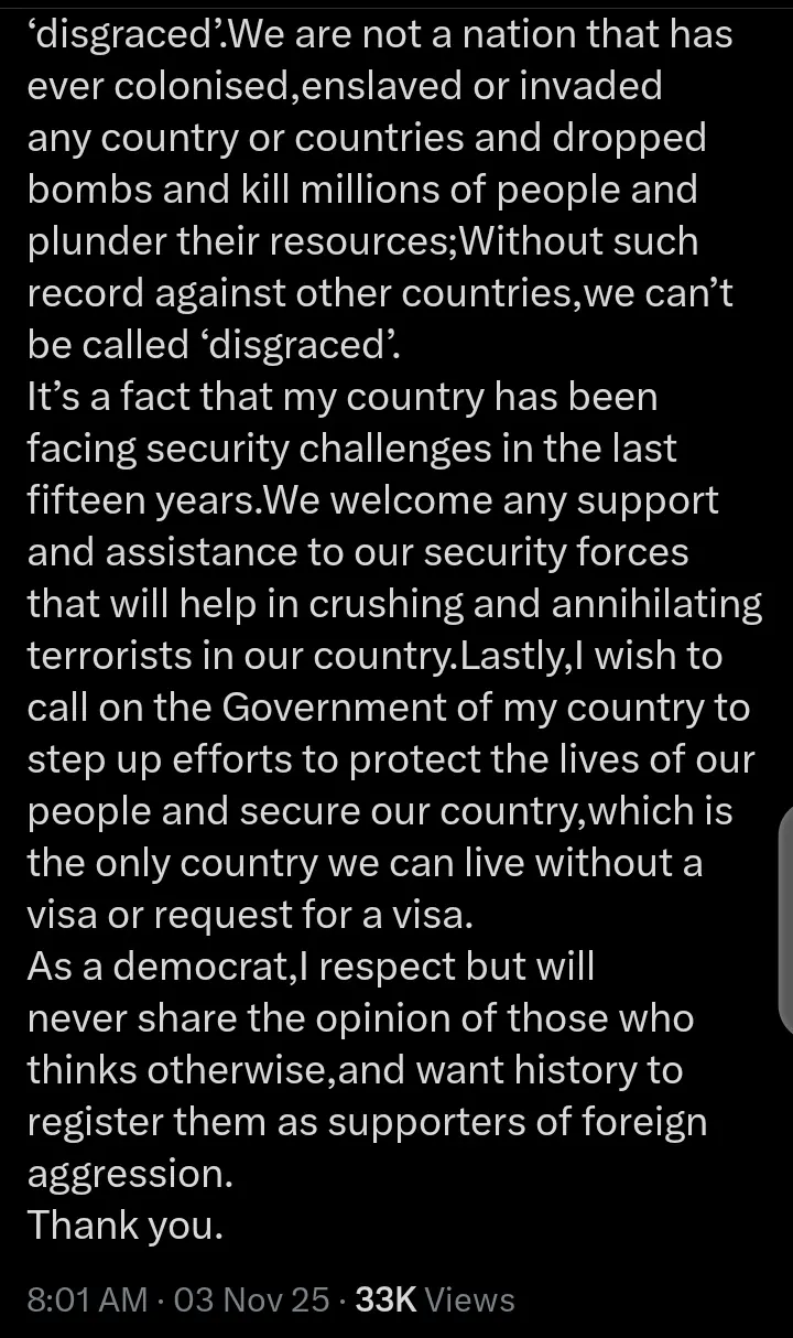 This came after the United State President called Nigeria a disgraced country and threatened to kill Islamic terrorists if the killing of Christians doesn’t stop.