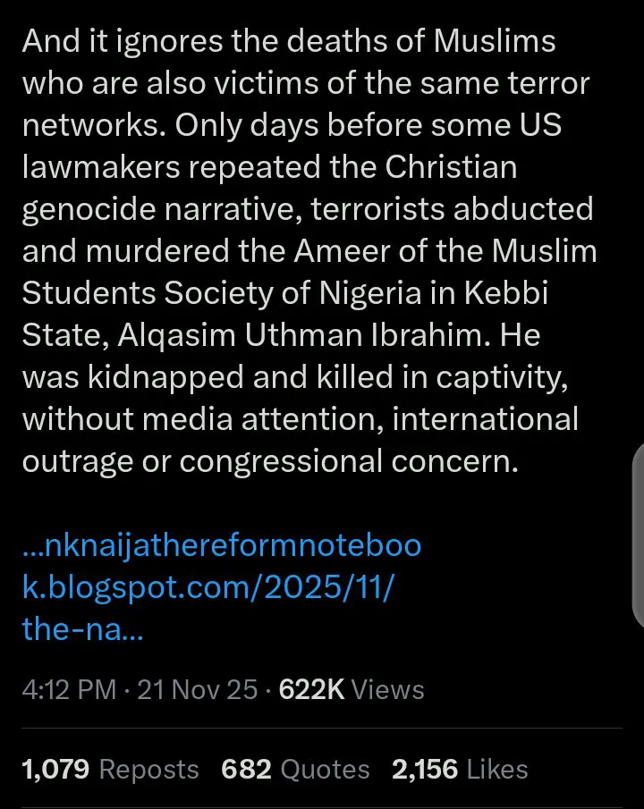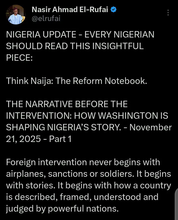 El-Rufai shared the report on his official X account on Friday, November 21, 2025, at a time when the country is under heightened international scrutiny. This followed recent statements by U.S. President Donald Trump, who designated Nigeria as a Country of Particular Concern, warning that the U.S. would take action against Islamic terrorist groups if the Nigerian government failed to stop attacks on Christians.