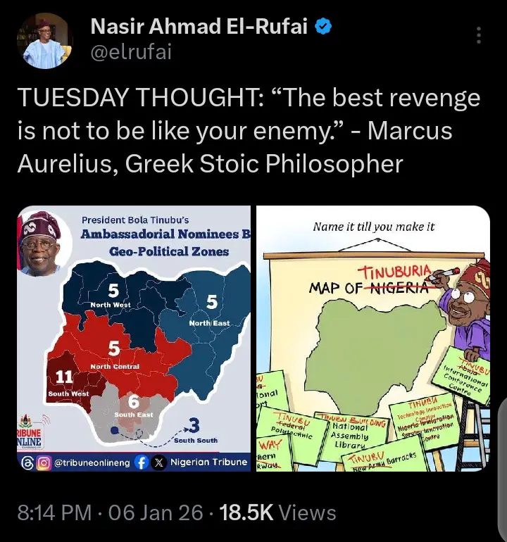 In addition to sharing the report and accompanying map, El-Rufai added a brief but pointed message on his page. He wrote, “The best revenge is not to be like your enemy.” Although the statement did not directly mention the president, many social media users interpreted it as a sharp political commentary on governance style and perceived inequities in federal appointments.