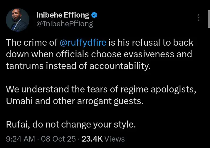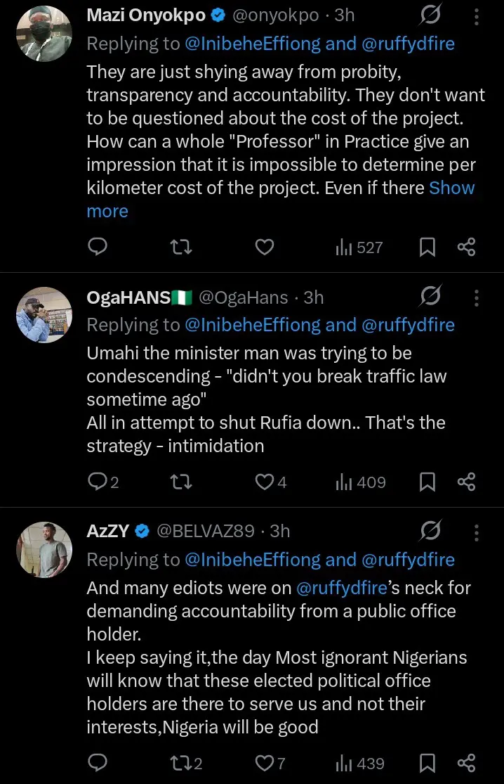 “Umahi, the minister, was trying to be condescending ‘didn’t you break traffic law sometime ago’ all in an attempt to shut Rufai down. That’s the strategy: intimidation,” the user commented.