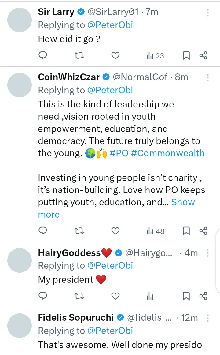 Peter Obi said during his time with the Commonwealth Secretary-General, they discussed about promoting democracy, deepening the rule of law and empowering young people across Commonwealth nations