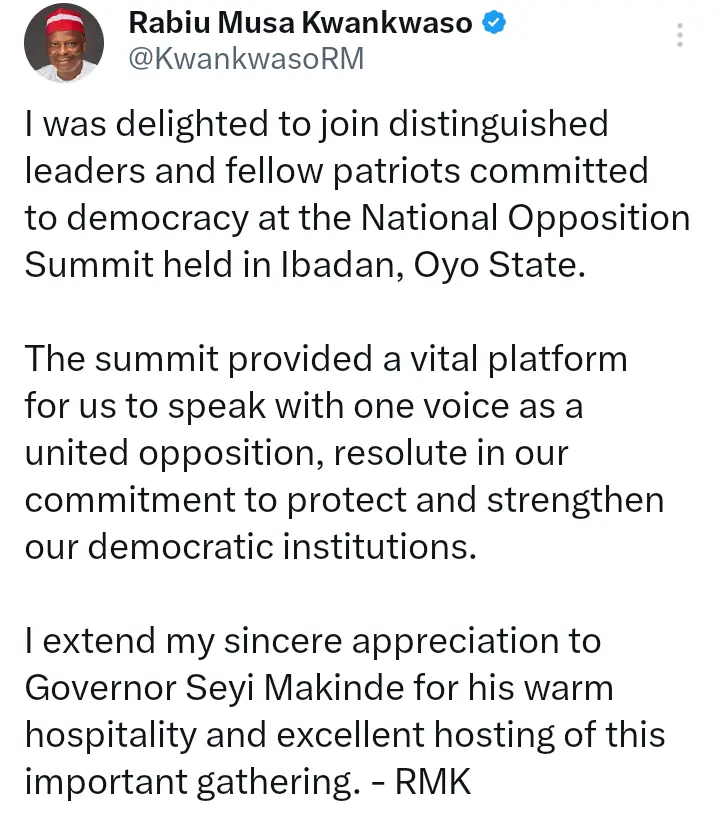 Here is what Rabiu Musa Kwankwaso wrote on his official X handle;