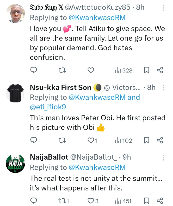 There have been several reactions from social media users after new photos of the former governor of Anambra state, Peter Obi and the former governor of Kano state, Rabiu Musa Kwankwaso surfaced online.