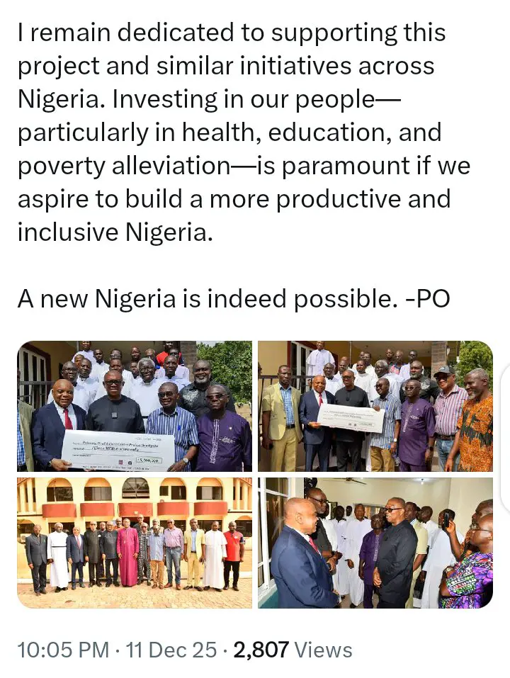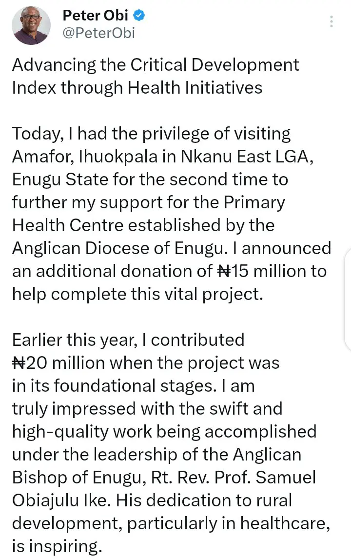 The post was accompanied by images that highlight his involvement with local clergy in the region. Obi’s support of the healthcare project underscores his ongoing commitment to improving public welfare, especially in underserved areas.