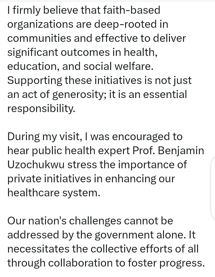 Obi’s post emphasized the importance of faith-based organizations in addressing key social challenges. He noted, “I firmly believe that faith-based organizations are deep-rooted in communities and effective in delivering significant outcomes in health, education, and social welfare.”