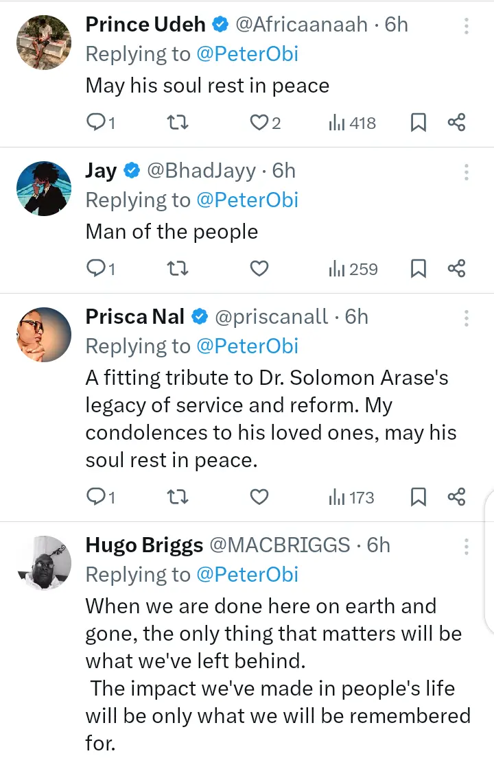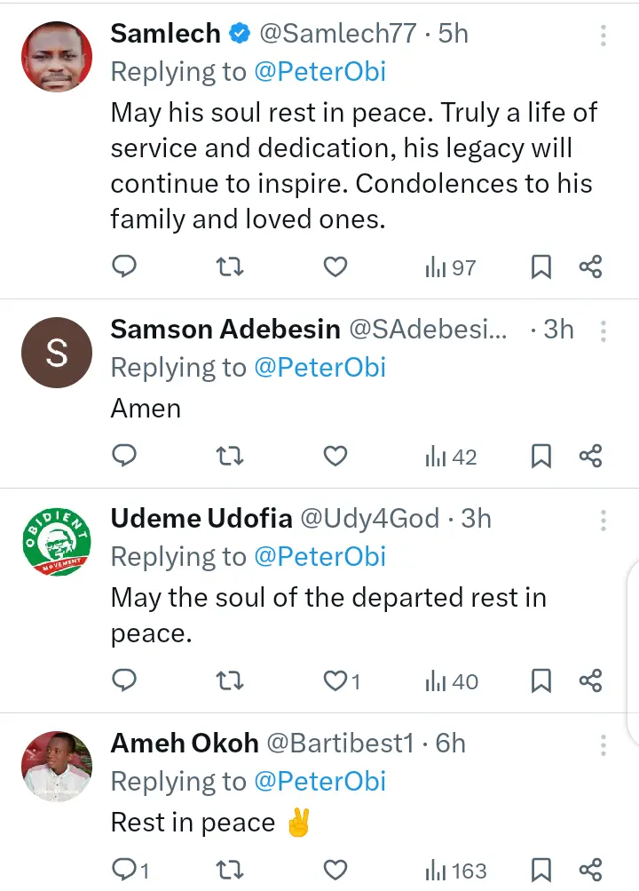 “On behalf of my family and the Obidient family, I extend my deepest condolences to his family, friends and colleagues. May God grant them strength and comfort in this difficult time and may his soul rest in perfect peace”.