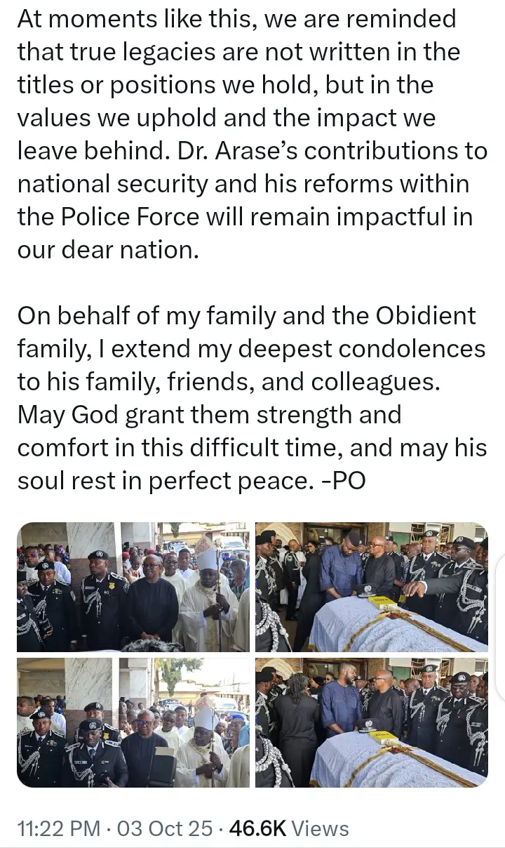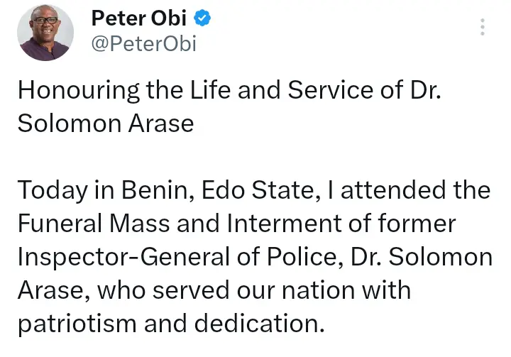 In the post that Peter Obi made on his official X handle, he said he attended the funeral ceremony of the former Inspector General of Police in Benin, Edo state.