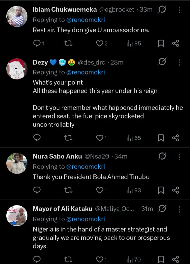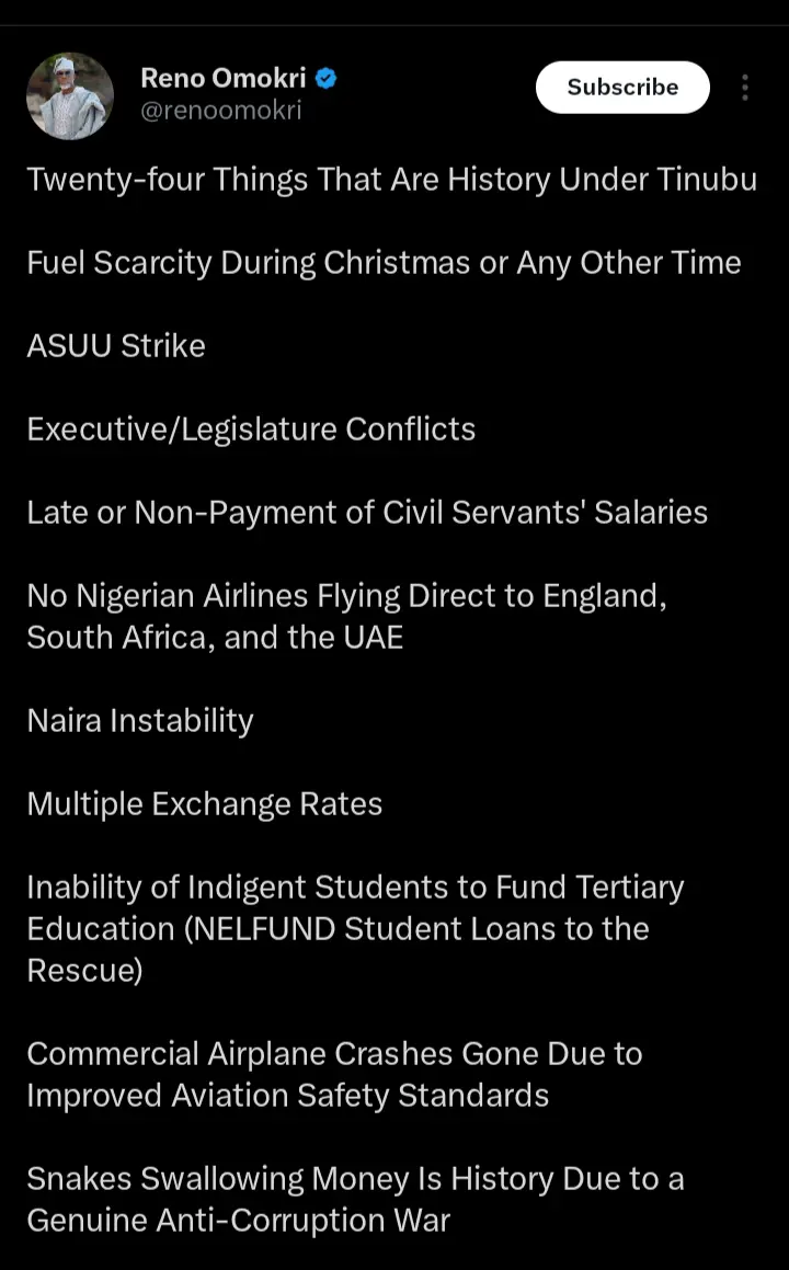 There have been diverse reactions amongst the general public and particularly social media users after ambassador designate and former presidential aide, Reno Omokri listed twenty four things that no longer occur under President Tinubu’s government. Notable among them was fuel scarcity during Christmas and ASUU strike.