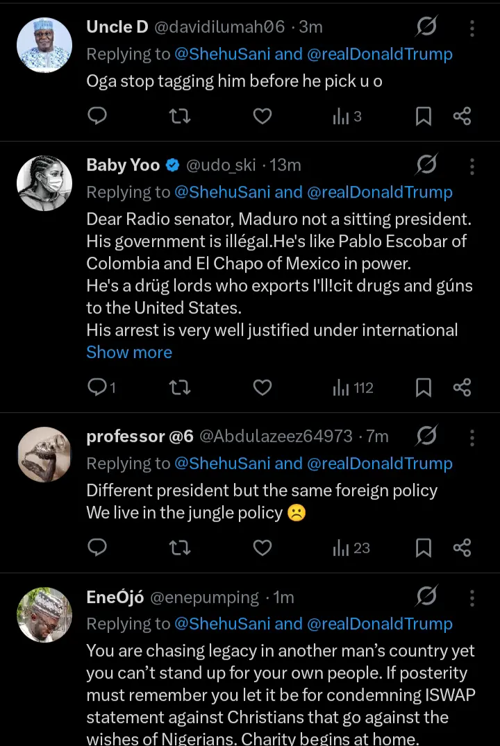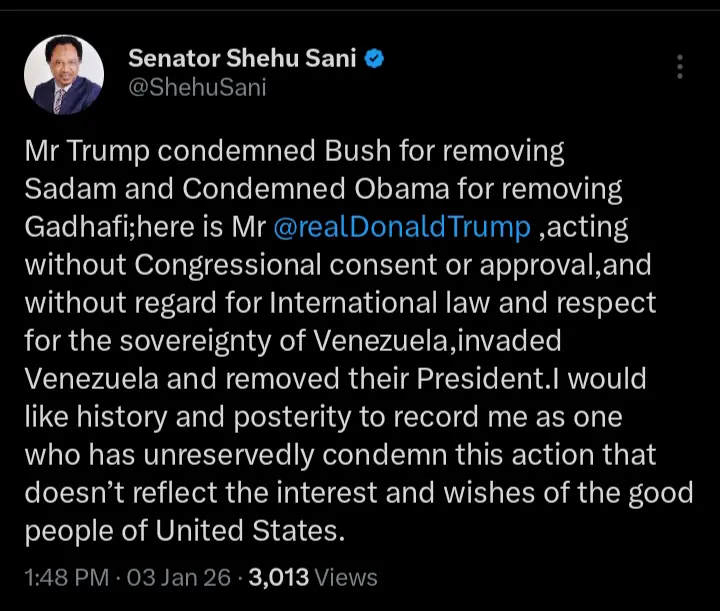 There have been several reactions from the general public and particularly social media users after former Kaduna central senatorial district lawmaker and renowned human rights activist, Senator Shehu Sani made a striking comment regarding the arrest of Venezuela President, Nicolas Maduro. According to the statements which were shared on his official X handle, he pointed out that he wanted to be remembered for condemning the arrest.
