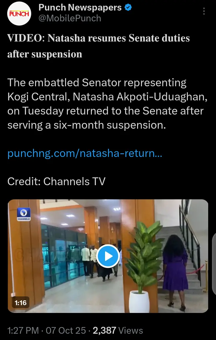 A viral video which captured the moment the Senator representing Kogi Central, Senator Natasha Akpoti, was spotted in the National Assembly has surfaced online.