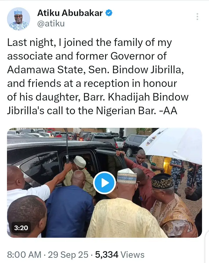 The footage captured the 2023 presidential candidate arriving at the venue and mingling with guests, underscoring his sustained connections within Nigeria’s political elite. In his accompanying post, Atiku wrote, “I joined the family of my associate and former Governor of Adamawa State, Sen. Bindow Jibrilla, and friends at a reception in honour of his daughter, Barr. Khadijah Bindow Jibrilla’s call to the Nigerian Bar.”