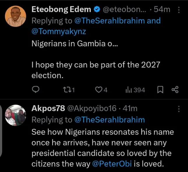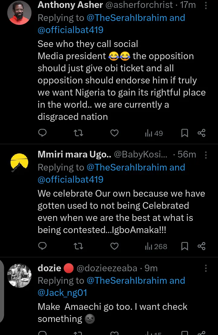 Social media users have taken to their official X account to react after a video which captured the moment some Nigerians were hailing the former governor of Anambra state and chieftain of the African Democratic Congress, ADC, Peter Obi surfaced online.