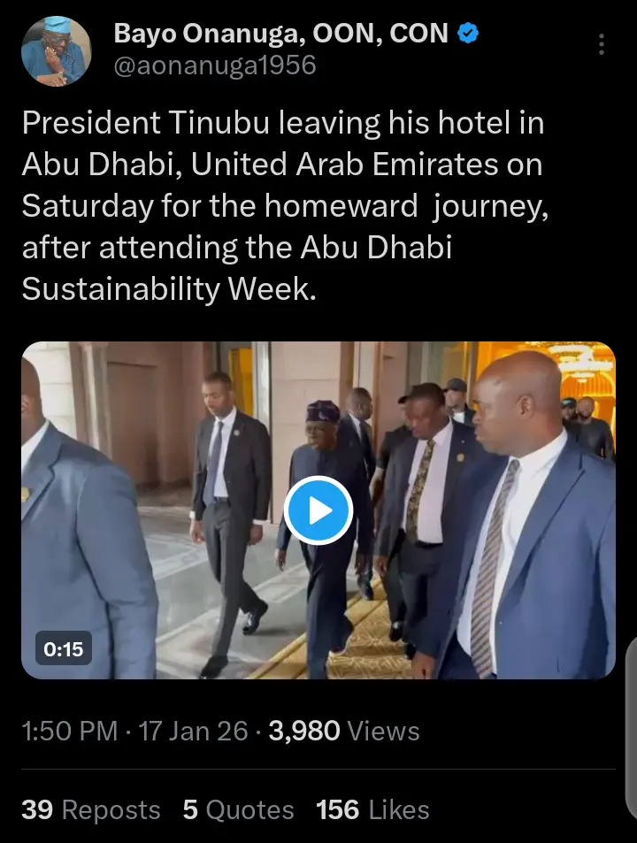 Bayo Onanuga, the Special Adviser to President Bola Ahmed Tinubu on Information and Strategy made the video available on his official X account on Saturday, January 17, 2026.