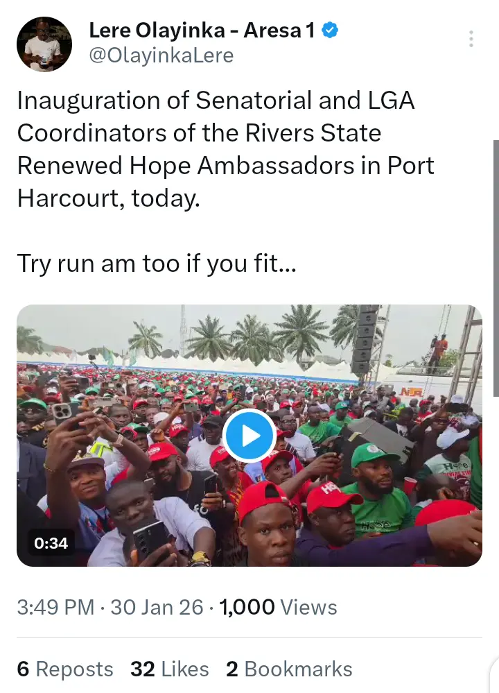 This was contained in a video that was posted on the official X handle of Lere Olayinka, the Senior Special Assistant on Public Communication and Social Media to the former governor of Rivers state, Nyesom Wike on Friday, January 30, 2026.