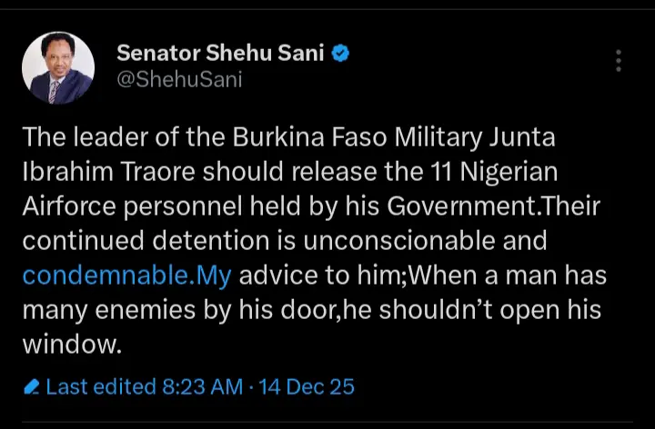 There have been diverse reactions amongst the general public and particularly social media users after the Burkina Faso government refused to release the detained Nigerian military officers and their aircraft. According to the statements which were shared on his official X handle, renowned former federal lawmaker, Senator Shehu Sani sent a strong warning to Burkina Faso president, Ibrahim Traore.