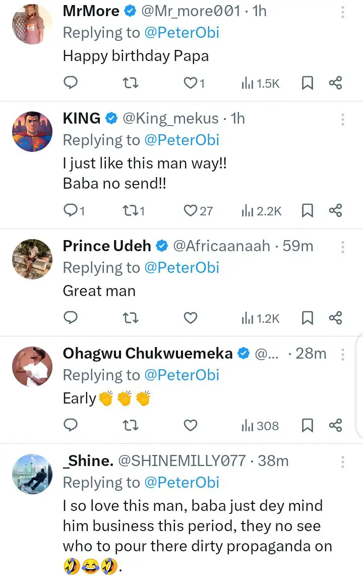 The post ignited platform engagement, blending admiration, humor, and advice. @flakkyBanky quipped, “Okwute Nigeria, stay blessed sir. Leave the rogbodiyan [chaos] for us to handle,” earning over 300 likes as a lighthearted call to avoid politics. @damiskid135 satirized rivals with: “Me in the comments drinking tears of RONUS and APC members expecting Peter Obi to say something about Trump message to Nigeria government,” sparking 250 interactions amid U.S. policy debates.