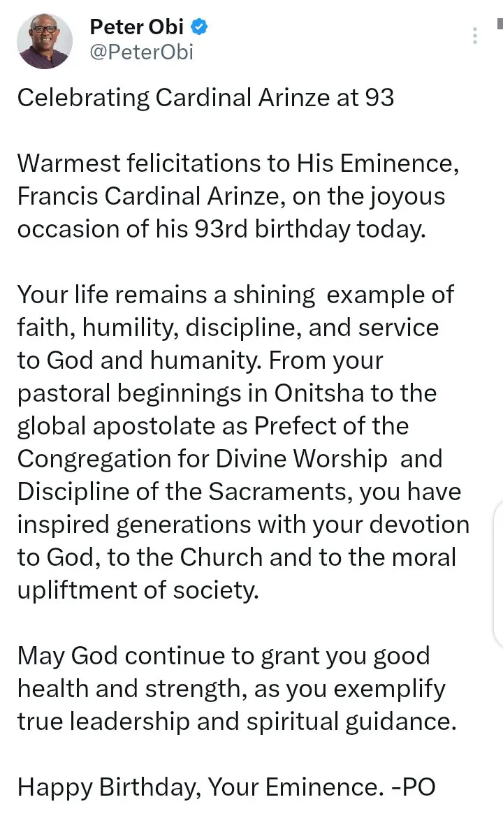 Obi shared the message via his verified X account on November 1, 2025, marking the cardinal’s 93rd birthday. Arinze’s life resonates in Nigeria’s religious landscape, where moral figures bridge divides. Born in 1932 in Nkwelle-Uzokwu, he ascended through the Catholic Church with intellectual and pastoral depth, becoming one of few African cardinals. From 2002 to 2008, he led the Vatican’s liturgy office, promoting culturally sensitive worship. In retirement, his reflections on ecumenism and social justice endure.