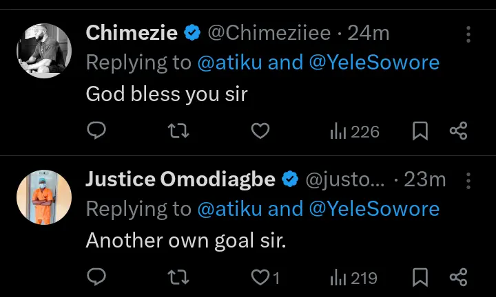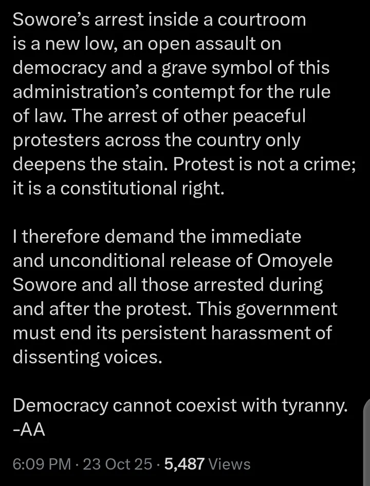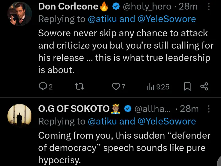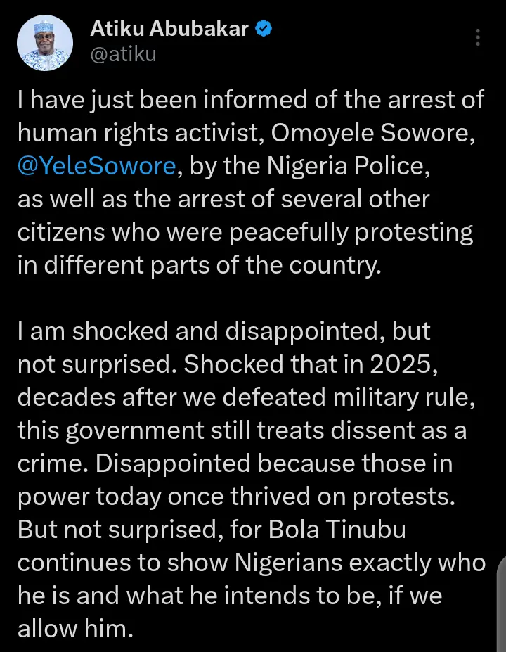 Social media users have taken to their official X account to react to the statement that was made by former Vice President, Atiku Abubakar after he heard that Nigerian activist, Omoyele Sowore has been arrested.