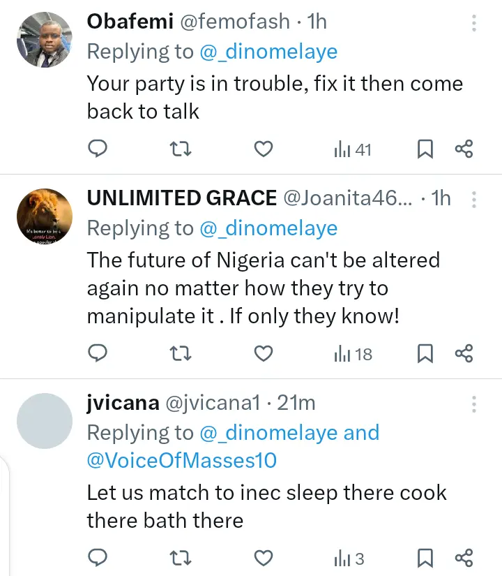 Several reactions have trailed the statement that was made by the former lawmaker who represented Kogi West at the National Assembly, Senator Dino Melaye after the Independent National Electoral Commission, removed the names of David Mark and Rauf Aregbesola from its portal.
