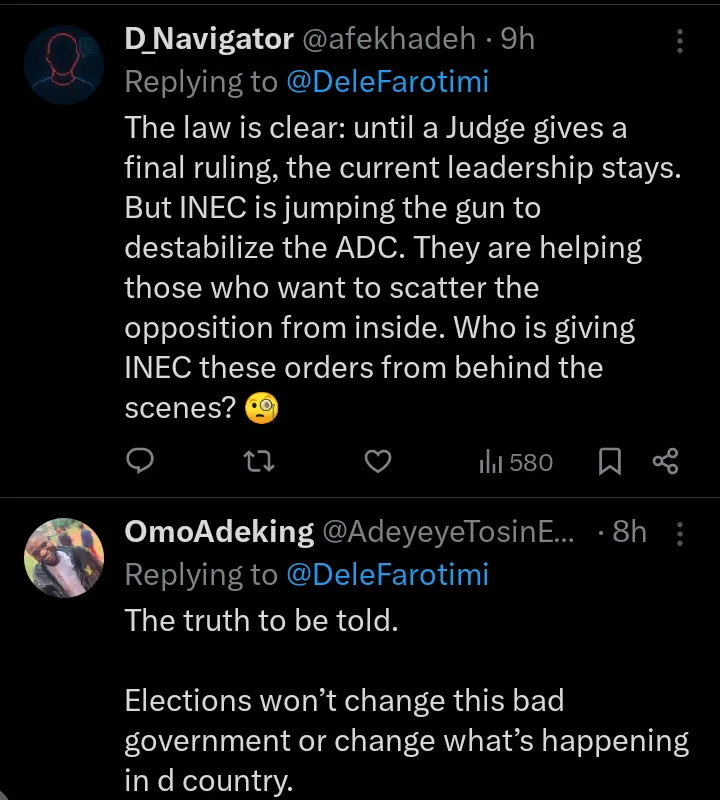 Social media users have taken to their official X account on April 1, 2026 to react to the statement that was made by Nigerian lawyer and human rights activist, Dele Farotimi after INEC removed the names of some leaders of the African Democratic Congress, ADC from its portal.