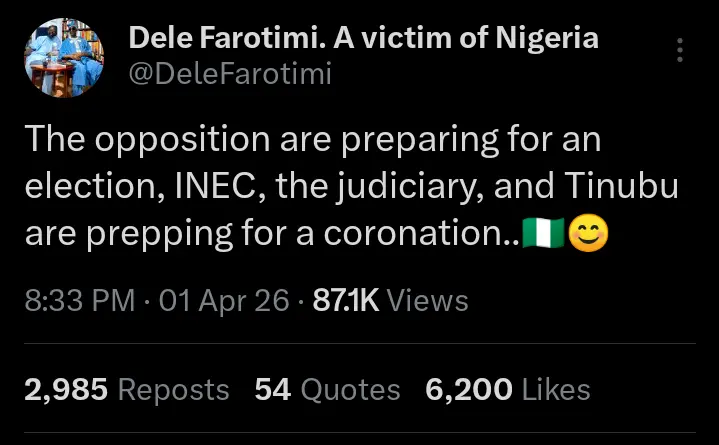 “The opposition members are preparing for an election, INEC, the judiciary and Tinubu are prepping for a coronation”.