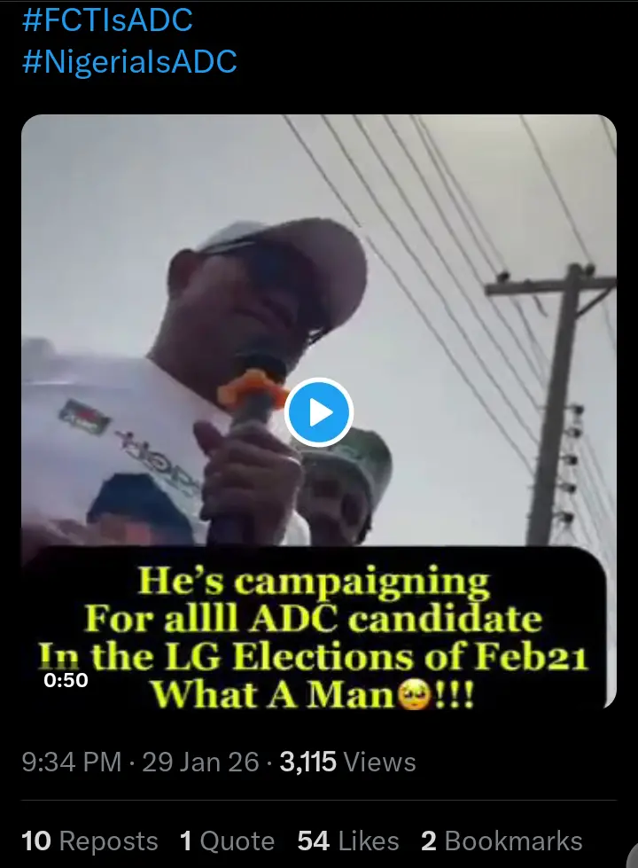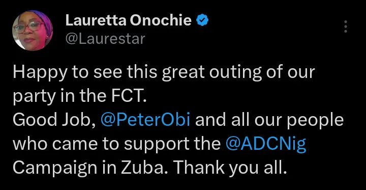 “Happy to see this great outing of our party in the FCT. Good job Peter Obi and all our people who came out to support the ADC campaign in Zuba. Thank you all”.