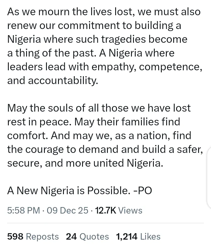 The reaction of Peter Obi was contained in a post that he shared on his official X handle on Tuesday, December 9, 2025.