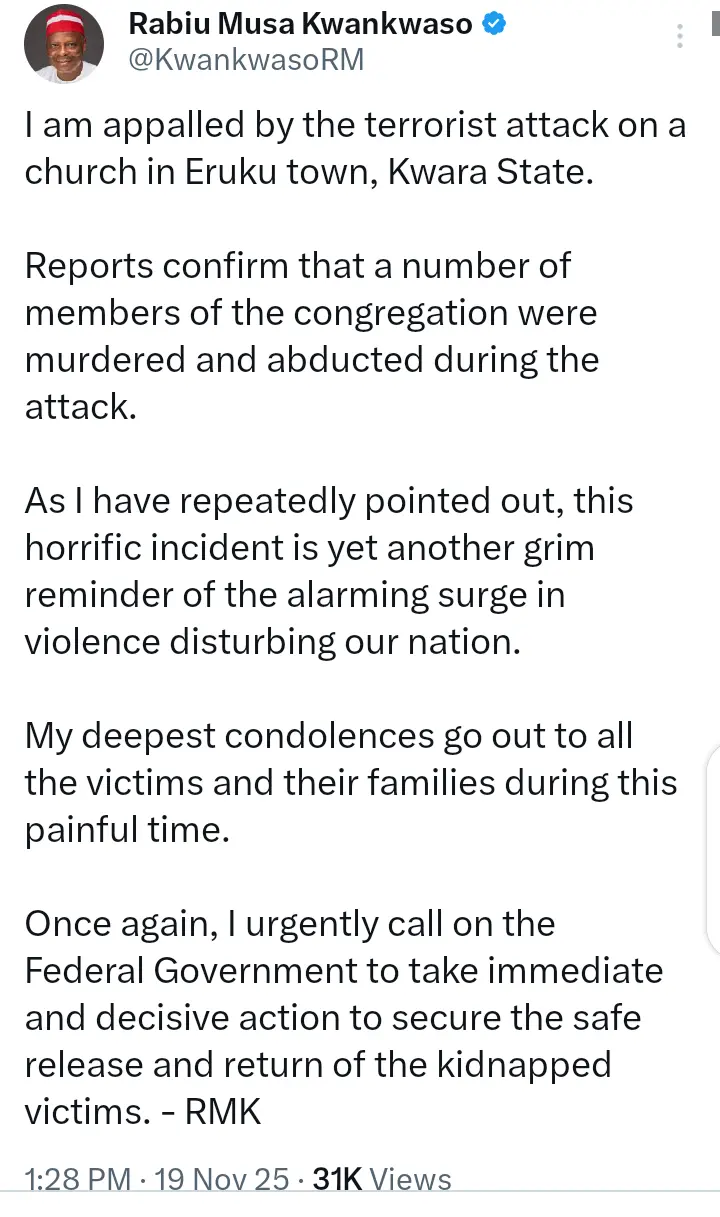 However, Rabiu Musa Kwankwaso has now shared his thoughts after the report surfaced online. In a post that he shared on his official X handle, he condemned the attack on the worshippers.