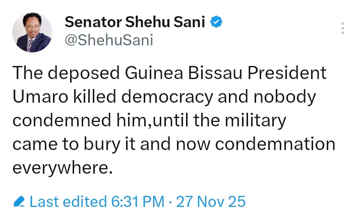 In the post that Senator Shehu Sani shared on his official X handle, he said the President of Guinea Bissau has also killed democracy.