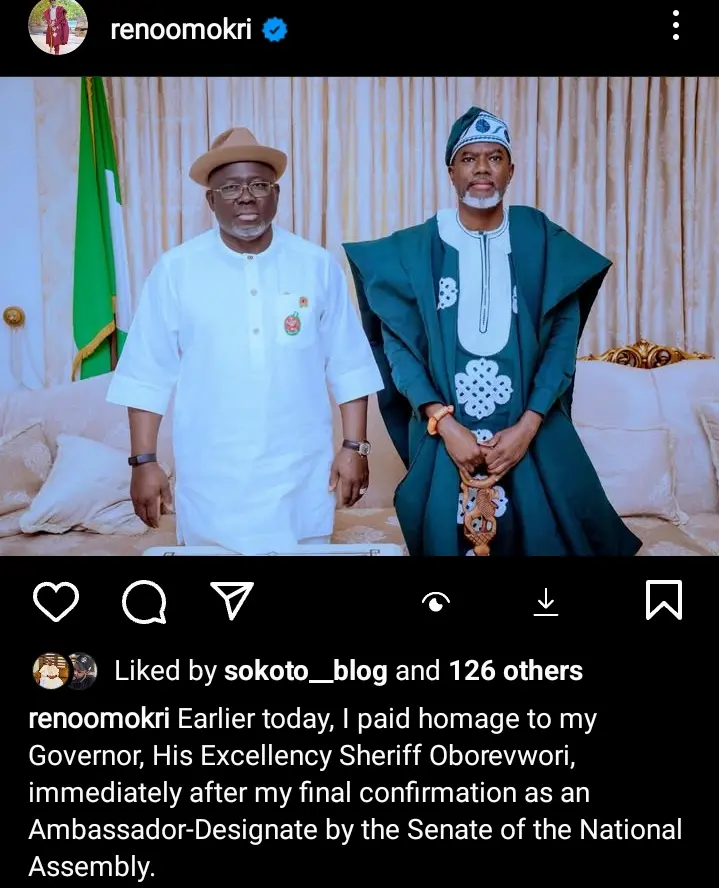 According to the recent post of Reno Omokri on his official Instagram account on Thursday, 18th December, 2025, the Ambassador-Designate disclosed that he paid homage to the Governor of Delta State, His Excellency Sheriff Oborevwori, immediately after his final confirmation by the Senate of the National Assembly.