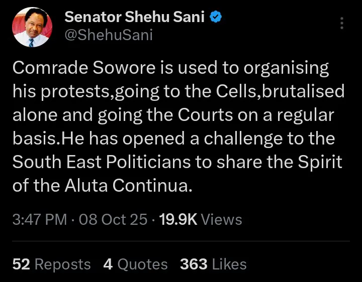 In a post that has since stirred conversation across social and political circles, Sowore wrote: