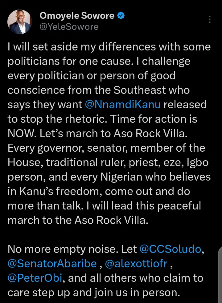 “Let’s march to Aso Rock. Every governor, senator, member of the House, traditional ruler, priest, Eze, Igbo person, and every Nigerian who believes in Kanu’s freedom. Come out and do more than talk. I will lead this.”