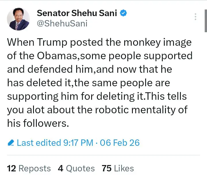 In his commentary, Sani expressed concern over what he described as blind loyalty among certain followers of the former U.S. president. He stated, “When Trump published the monkey image of the Obamas, many defended him; now that it’s been taken down, those same people praise him for that decision. This reflects the robotic mindset of his supporters.” His remarks have since generated discussion online.