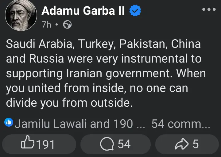 In a post on his verified Facebook account, Garba argued that Iran has historically survived international isolation because of strategic backing from key global and regional powers.