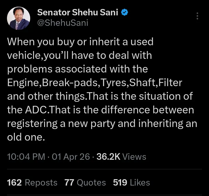 Reacting, Senator Shehu Sani stated that the issue in the African Democratic Congress can be likened to a person who bought a used car. The former Kaduna lawmaker stated that it is better to register a new party than to inherit an old one.