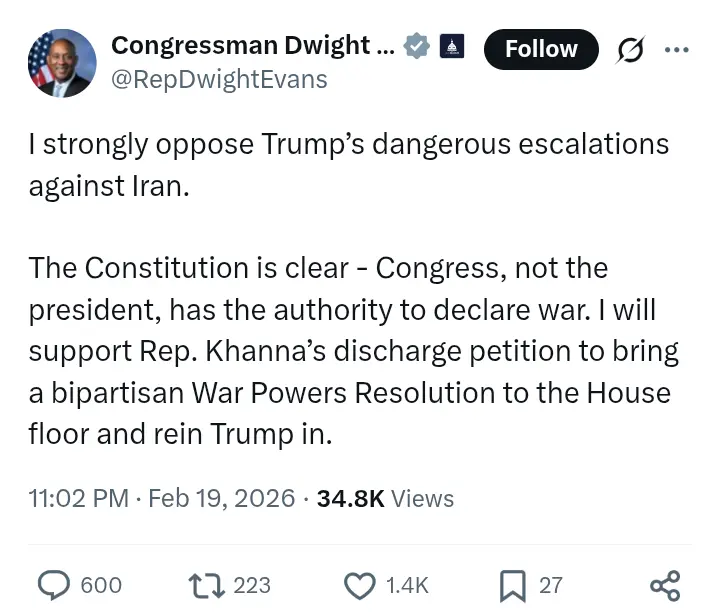 Against this backdrop, Evans emphasized that the U.S. Constitution grants Congress — not the president — the sole authority to declare war. He announced his support for a discharge petition led by Representative Ro Khanna, aimed at forcing a bipartisan War Powers Resolution onto the House floor.