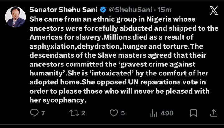 According to a post on X on Saturday, March 28, 2026, senator Shehu Sani, a prominent Nigerian human rights activist and lawmaker, has sharply criticized Kemi Badenoch, the leader of the UK Conservative Party and a politician of Nigerian Yoruba descent, for her stance against a United Nations resolution on the transatlantic slave trade and reparations.