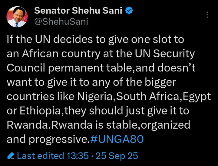 However, Shehu Sani responded critically to the idea. Posting on his official X (formerly Twitter) account, the former senator suggested that if the UN chooses not to grant the seat to any of the continent’s major powers — Nigeria, South Africa, Egypt, or Ethiopia — then Rwanda would be a better choice.